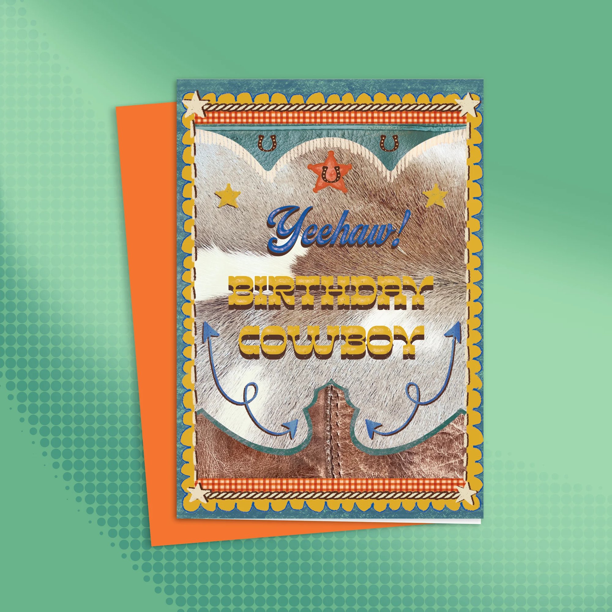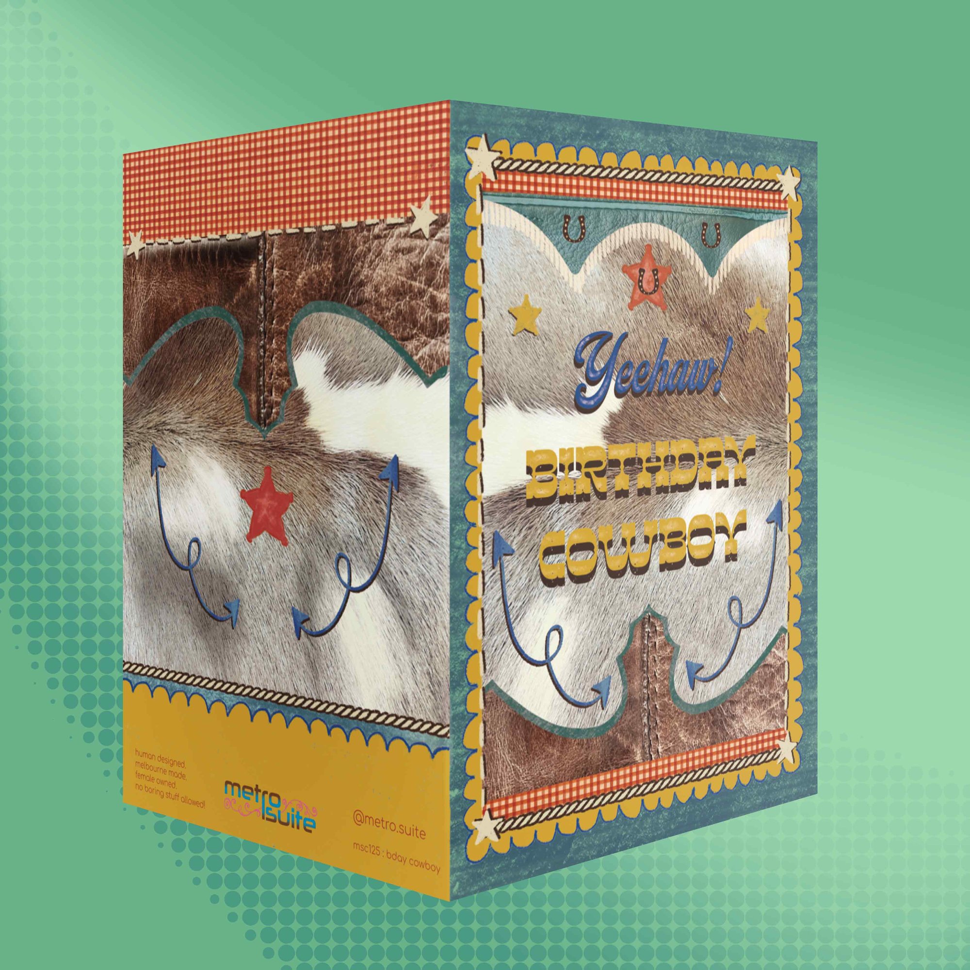 This artwork is vintage-inspired, western af and very wholesome! Using original photos with digital montage techniques, we have leather, stitches, arrows, star badges, gingham and cowhide! Giddy Up!