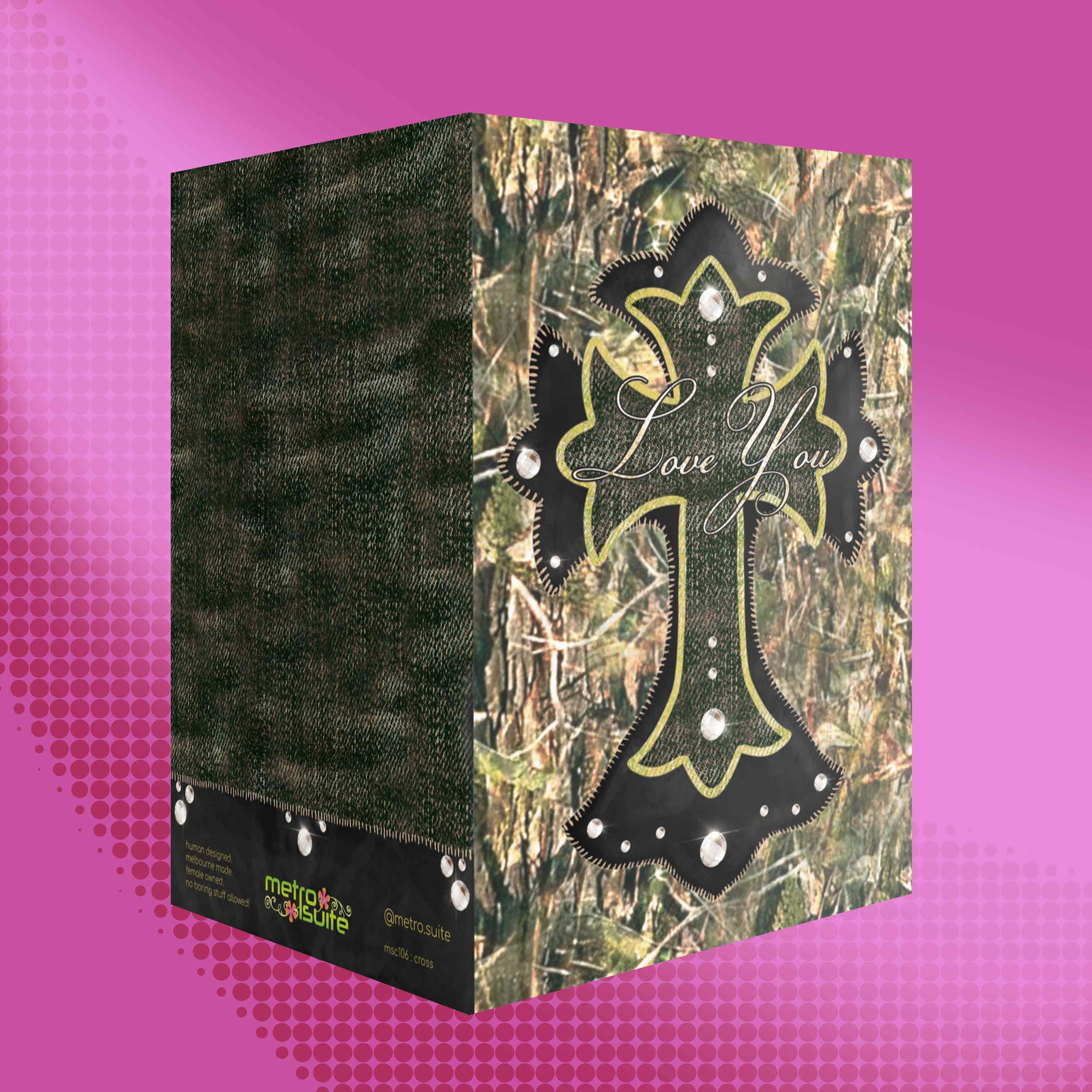 This is your Y2K camo McBling calling card. She is bedazzled, textured, and everything you’d ever want on an overpriced vintage Von Dutch hat.